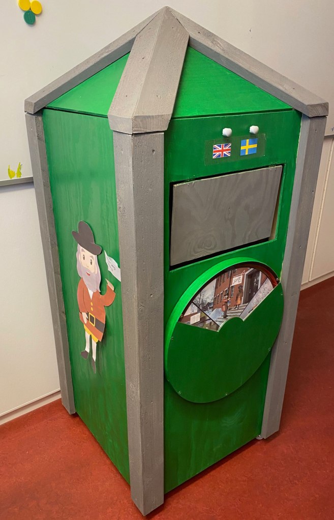 The project group identified early on the “tourists with children” persona as main target group for the solution, exploiting storytelling as a way to motivate people to behave sustainably and recycle their waste. The pointy design of the top is intended to discourage people to leave the trash on the bin, instead than inside it, while the coolers are chosen to melt with the surrounding environment. The final prototype is composed of a waste bin that, after being activated by throwing trash into it, narrates the story of Rosenbom (a popular character in Karlskrona) while displaying its story through images on a rotating disk.