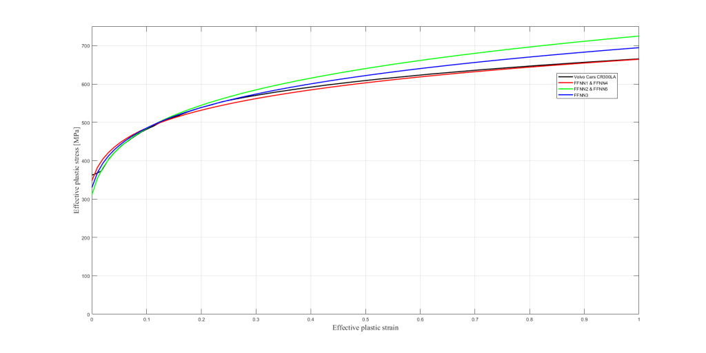 The outline of the thesis involves four different phases; experiments, simulations, building the high-fidelity database, and building and optimizing the FFNN. The experiment phase involves tensile testing of three different types of specimens in three material directions with Digital Image Correlation (DIC) to capture local strain. The simulation phase is to replicate all the experiments in LS-DYNA and perform finite element simulation. The finite element models are simulated 100 times and, respectively, 1000 times with different material parameters within a specific range. This range has a lower and upper bound that covers the experimental results. The database phase involves extracting the data from a huge amount of simulations and then extracting the key characteristics from the force-displacement curve. The last phase is building the FFNN and optimizing the network to find the best parameters. It’s first optimized based on Root Mean Square Error (RMSE) and then points from the Swift hardening curve and Barlat yield 2000 criteria are compared with experimental points.