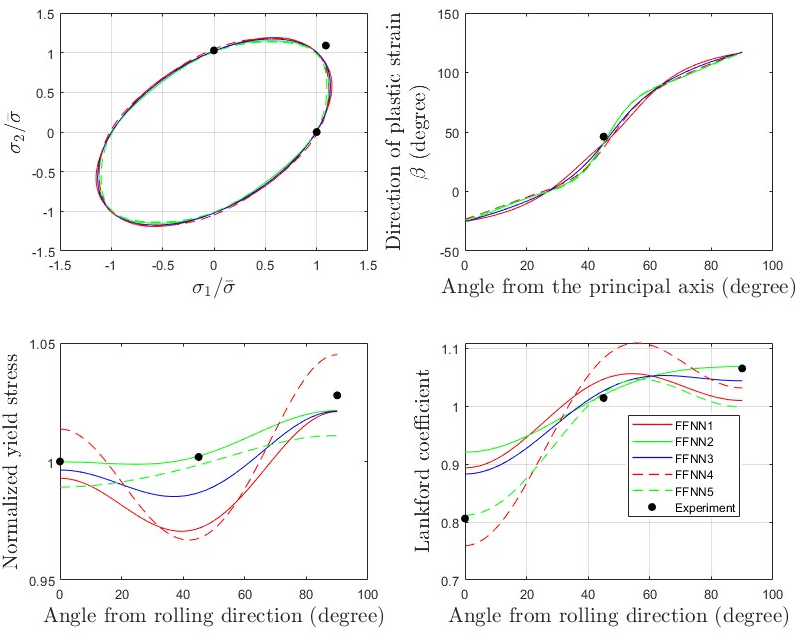 terial parameters with an accuracy of over 99 % for the hardening law at the points chosen for optimization and the anisotropy parameters are optimized to 97 % accuracy for the yielding points and Lankford coefficients. The thesis concludes that the FFNN can accurately predict the material parameters with real experimental data. The effectiveness of using this method is significantly faster than traditional methods because only one type of test is needed.